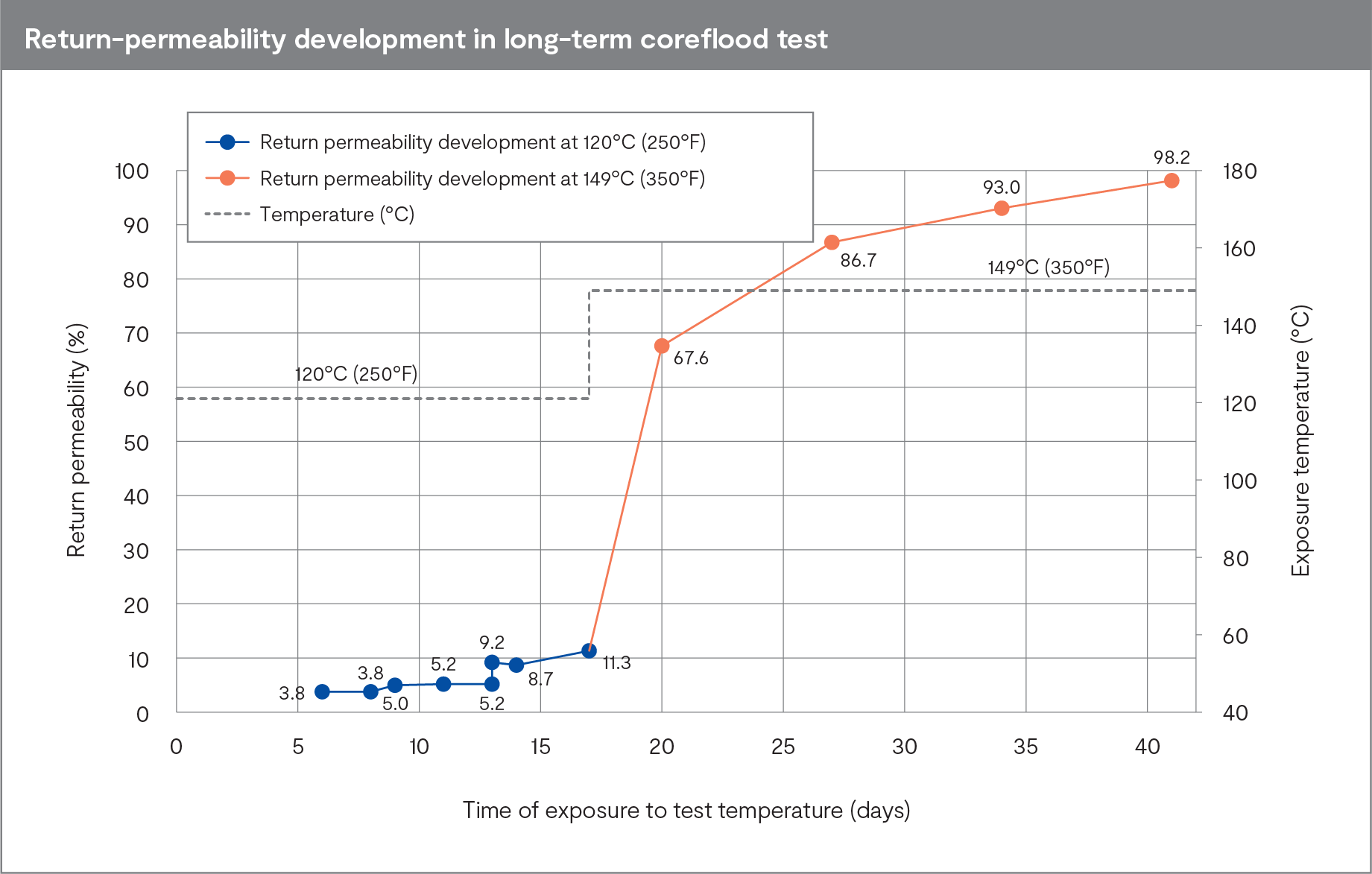 Based on the new understanding of biopolymer self-breaking rates and the hypothesis that these can significantly affect the outcome of coreflood testing, a revised long-term coreflood test was designed and trialed. Multiple suspension periods were introduced at two different temperatures and permeability was measured after each suspension period. The test continued as long as permeability improvements were observed. The results were stunning, with the core cleanup rate increasing from 3% to 98% during the extended test duration of 41 days. This is perhaps not difficult to understand when the supposed 'damage' is caused by filtrate retention. It is naturally harder for filtrate to escape when hindered by unbroken biopolymers, or when these polymers increase its viscosity.6